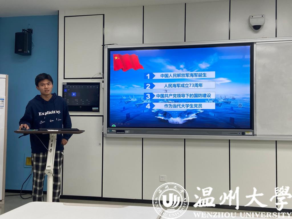 会议伊始,由戚成凯同志带领同志们学习“庆祝中国海军节与中国共产党领导下的国防建设”。戚成凯同志从中国人民解放军海军的诞生、人民海军成立73周年、中国共产党领导下的国防建设以及作为当代学生党员应当如何等四个方面展开,为各位同志们讲解中国人民解放军海军背后的故事,在介绍完党领导下的国防建设之后,他强调作为的当代大学生,应当具有国防安全意识,多多学习党史,做好本职工作,此外,作为一名退伍军人,他鼓励大家积极参与国防建设,为祖国的建设添砖加瓦。