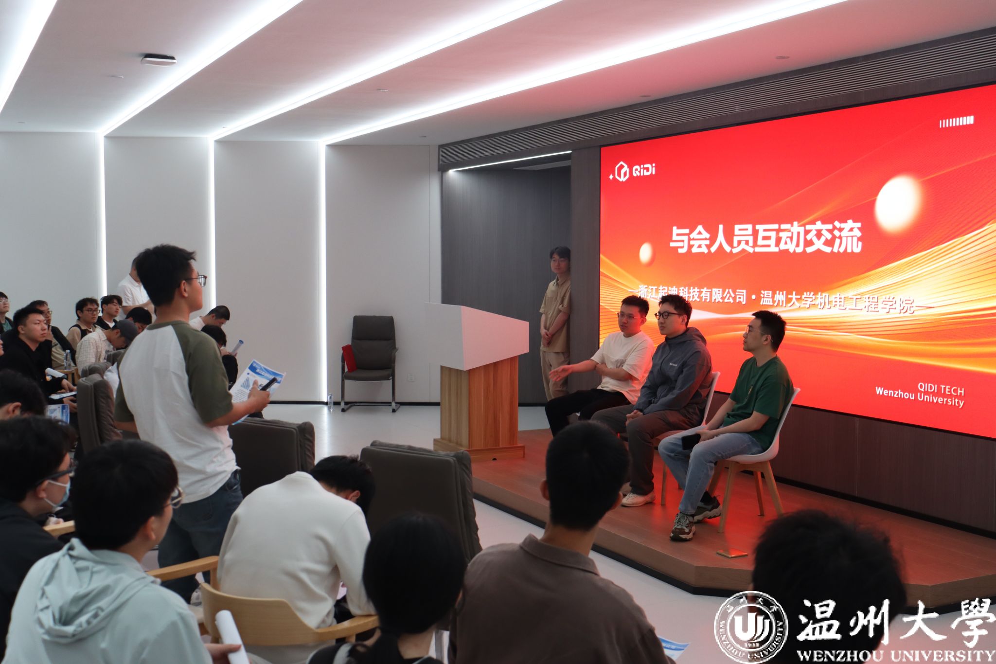 最后的自由交流环节,同学们围绕“职业能力储备”“行业发展趋势”“企业用人标准”踊跃提问。企业技术骨干与HR负责人逐一解答,并给出建议:“除了专业技能,企业更看重学习能力与团队协作意识”“关注行业动态,提前规划职业路径才能抢占先机”。