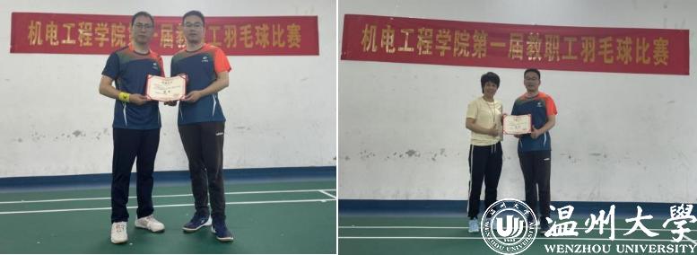 本次比赛共分为四组,分别为男单龙虎组、鲲鹏组,以及女单龙虎组、鲲鹏组,各组均直接采用淘汰赛制。经过激烈角逐,单龙虎组男单、女单冠军分别由程元皓老师、陈亚绒老师获得,鲲鹏组男单、女单冠军分别由方铁辉老师、张吴湖老师获得。赛后由成人网 副院长李勇老师为获奖教职工颁发荣誉证书,并合影留念。此外,成人网 工会还精心为每个参赛的运动员准备了精美纪念品,并获得了一致好评。