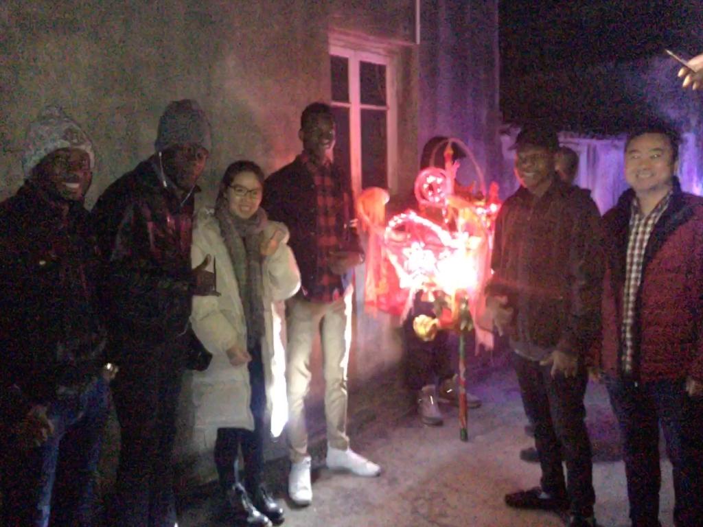 一行6人到达后村,此时龙灯已经点亮,在乐队的敲锣打鼓声中舞动起来。留学生们第一次见到此景,异常兴奋。同行老师向其介绍了该村落的元宵龙灯习俗,告诉他们龙灯会挨家挨户的“表演”,为每户人家祈求丰收与平安的一年。来自坦桑尼亚的MWANGOSI GAYO GABRIEL告诉我们在他们国家烟火也是明令禁止,所以很少有看到这么盛大的景象。津巴布韦的Alfred表示在他们国家虽然没有禁令烟花,但只有在重大节日才有,而且他还说“我第一次看到这种祈福方式,中国文化真是神奇,很迷人。”