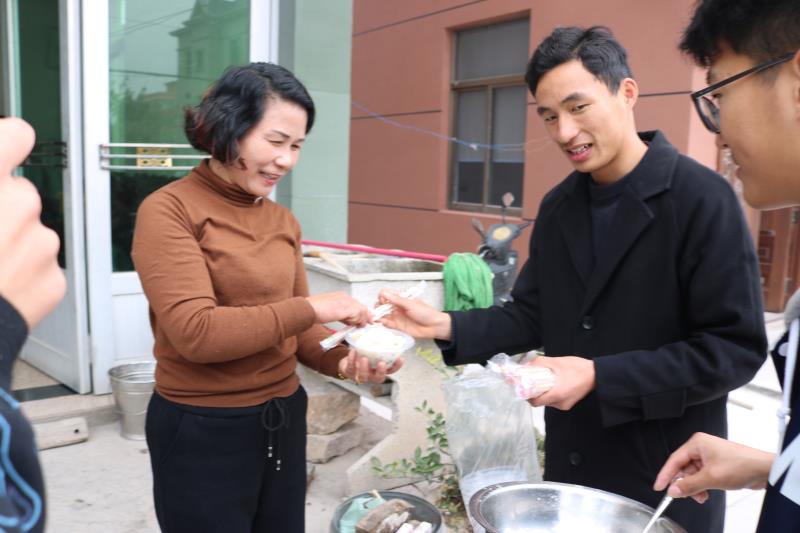 在九村村书记的引导下,全体成员自主分为三组:第一组负责整理九村村委会红色书屋,第二组负责张贴海报,及给村民们分发有关十九大相关关键词的宣传单,宣传十九大精神,第三组则留在教育基地,准备包饺子,并送予附近的村民,传递温暖,同时也进行发放十九有关宣传单的活动。最后,全体成员将亲手包好的饺子送给九村文化礼堂中的老人们,他们表达了对我们的谢意。最后,全体成员在礼堂前进行了合影留念,宣告本次志愿者活动的圆满结束。