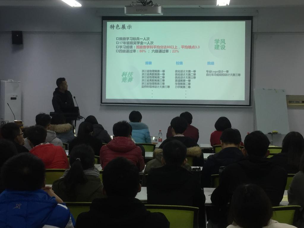 接下来主持人按照抽签顺序依次报幕,各班级代表依次上台进行班级介绍。评比过程中各班级的展示生动活泼、高潮迭起。各班发言人向在场的老师和同学们展示了各班风采,包括班级介绍、学风建设、团建活动、考级考证、科研竞赛和未来展望等几个方面,他们的精彩演讲搏得了在场老师和同学们的热烈掌声。