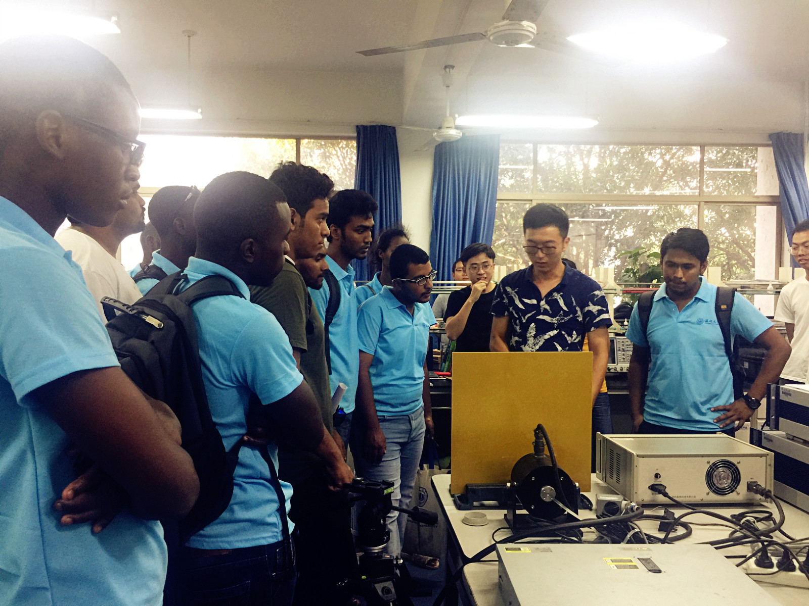 新生见面会后,学院实验教学中心主任林礼区带领留学生参观了学院实验室和学生科技创新成果展厅