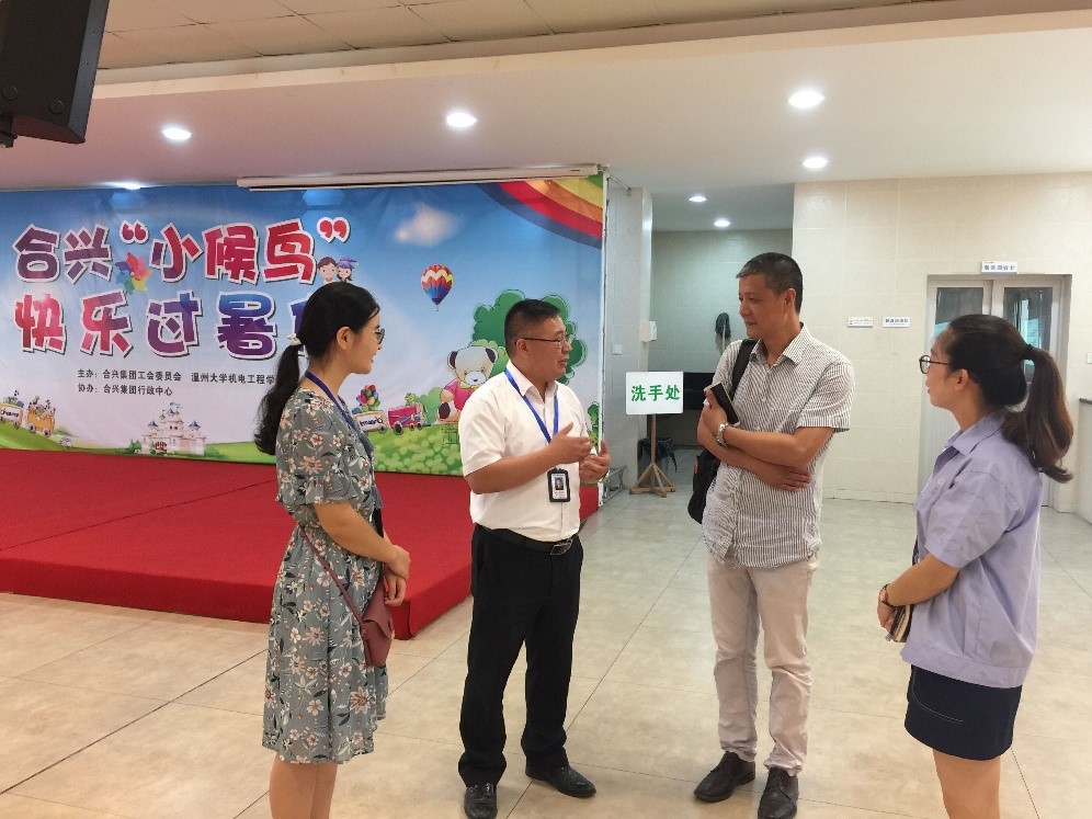 2017年8月12日上午,成人网 周荣书记和指导教师林礼区在合兴集团行政中心小候鸟项目负责人赵经理、联系人付程程的陪同下,前往温州市乐清虹桥温大成人网 “小候鸟”二期暑期实践队进行慰问视察。