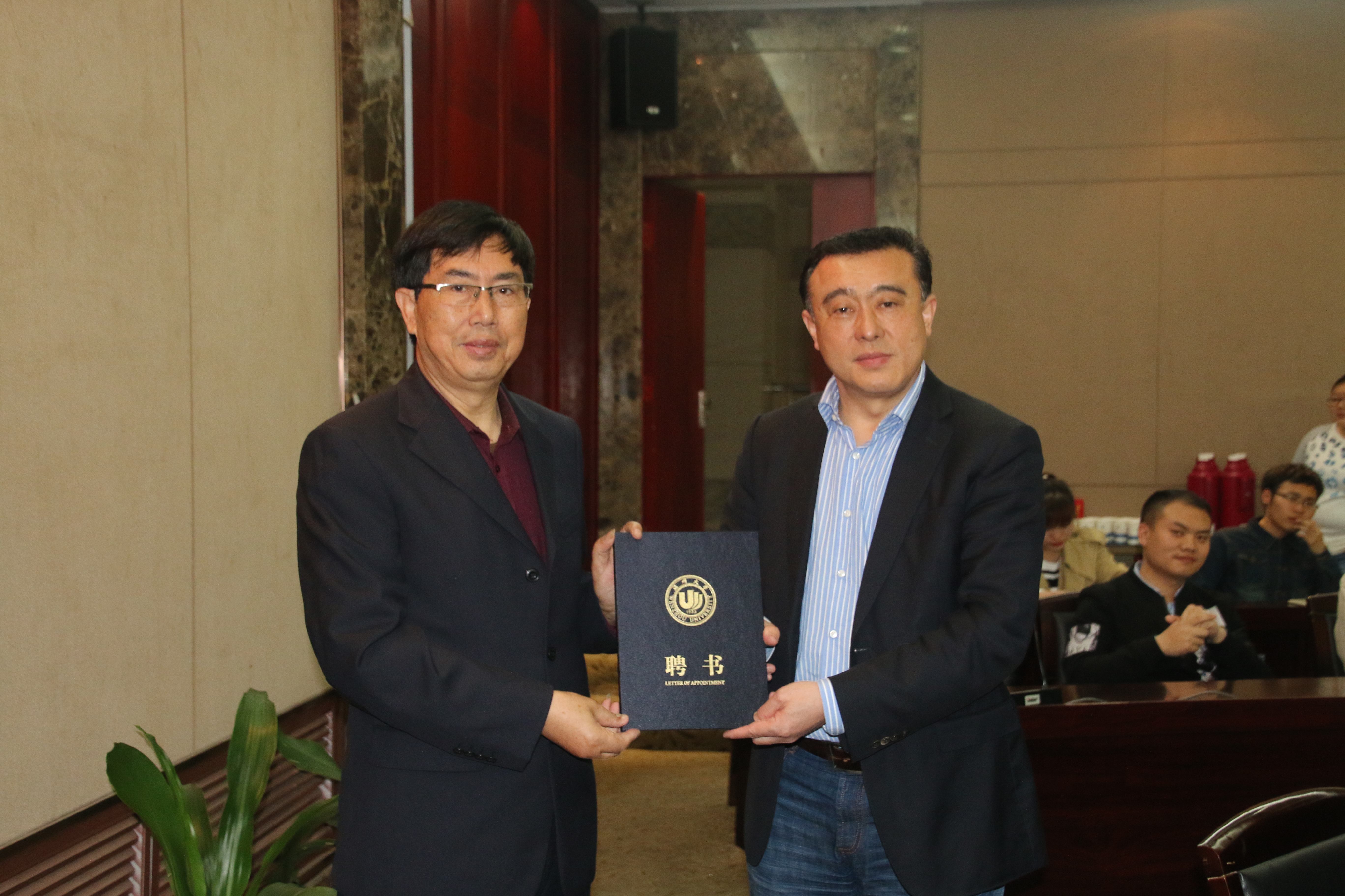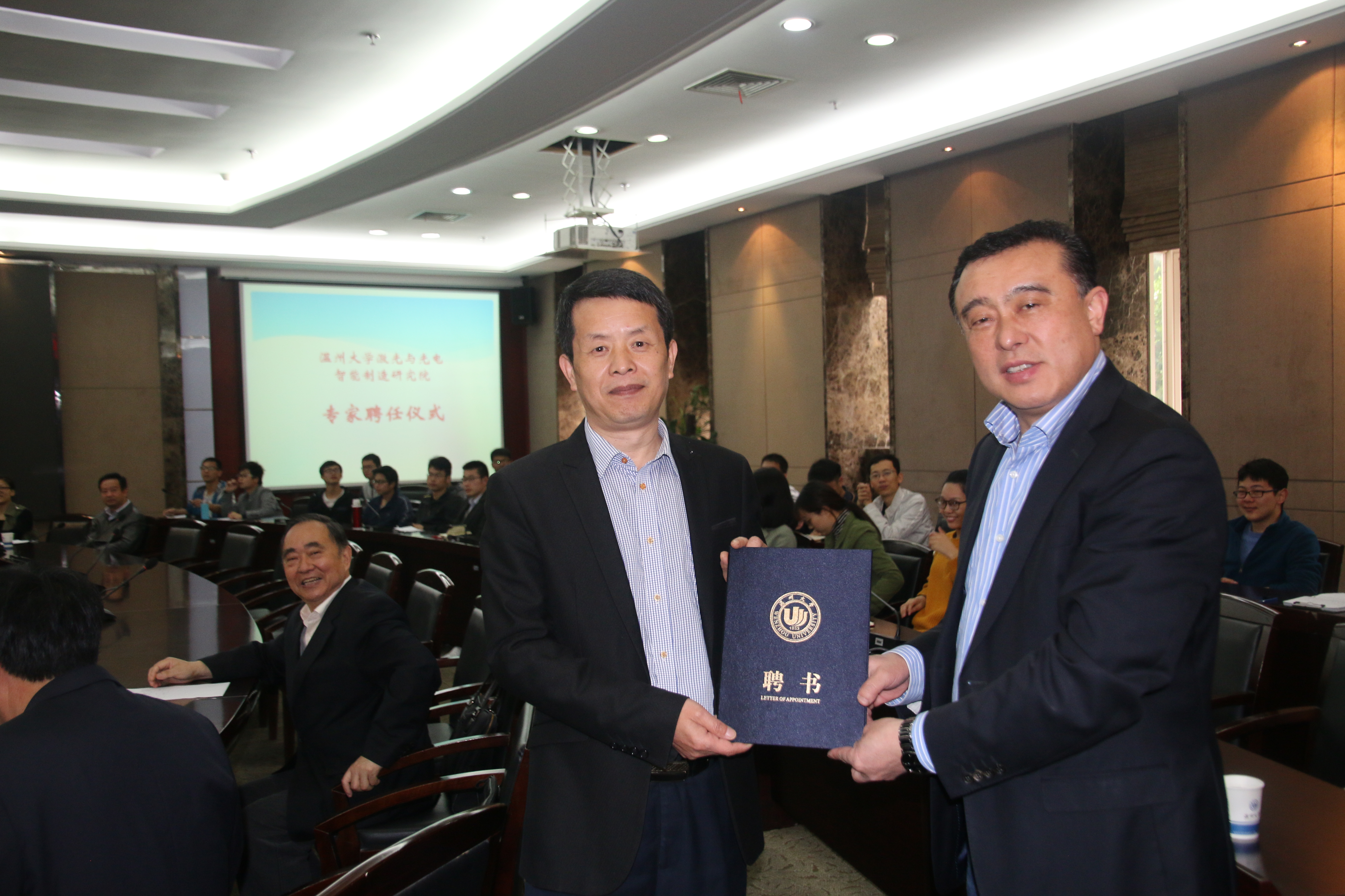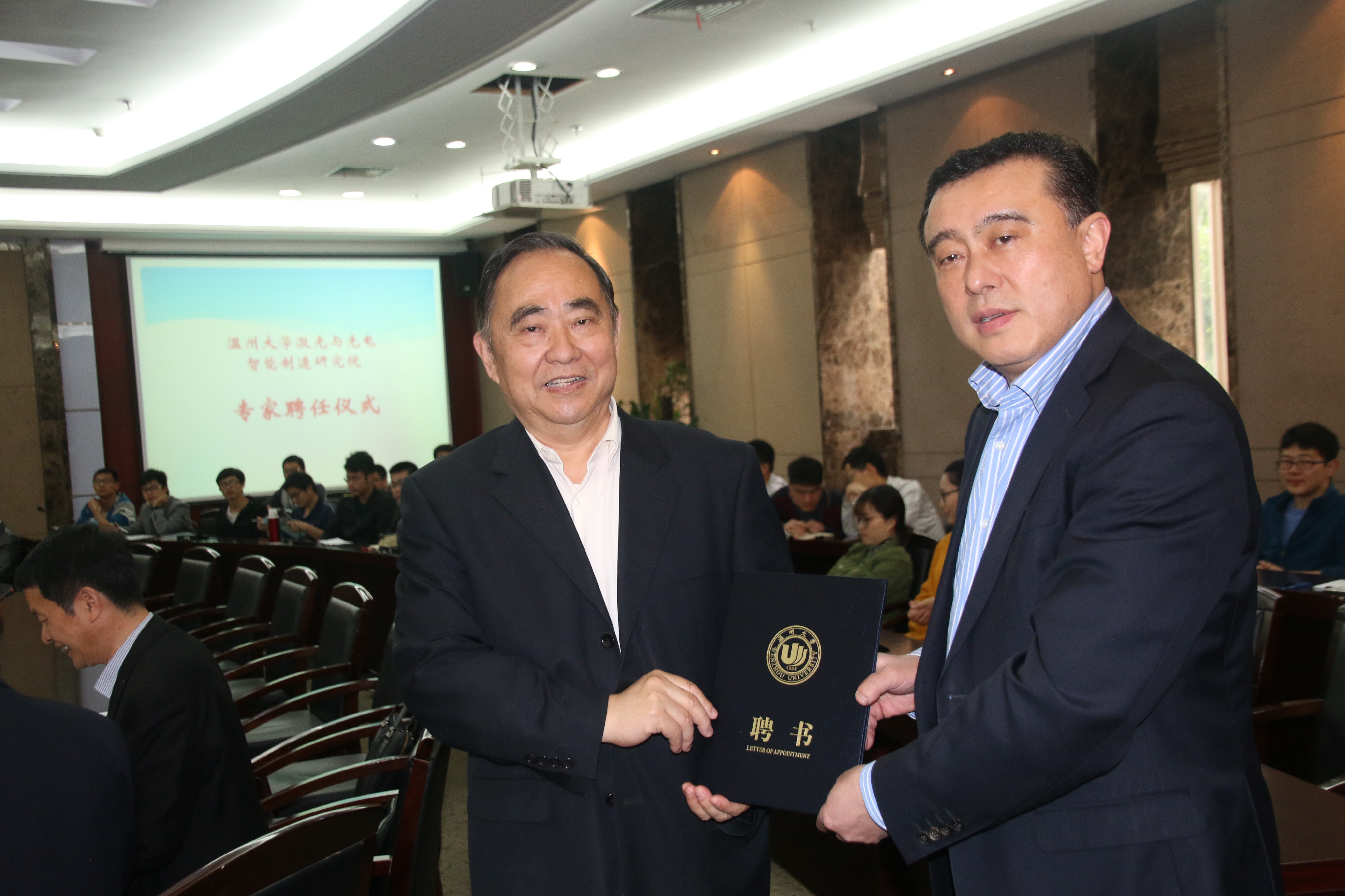 薛伟教授代表成人网 激光与光电智能制造研究院向谭建荣院士和其他专家学者颁发了聘书,聘请谭建荣院士担任研究院的共享院士,聘请郭志坚等三位专家担任兼职教授,共同指导激光与光电智能制造研究院的建设工作。