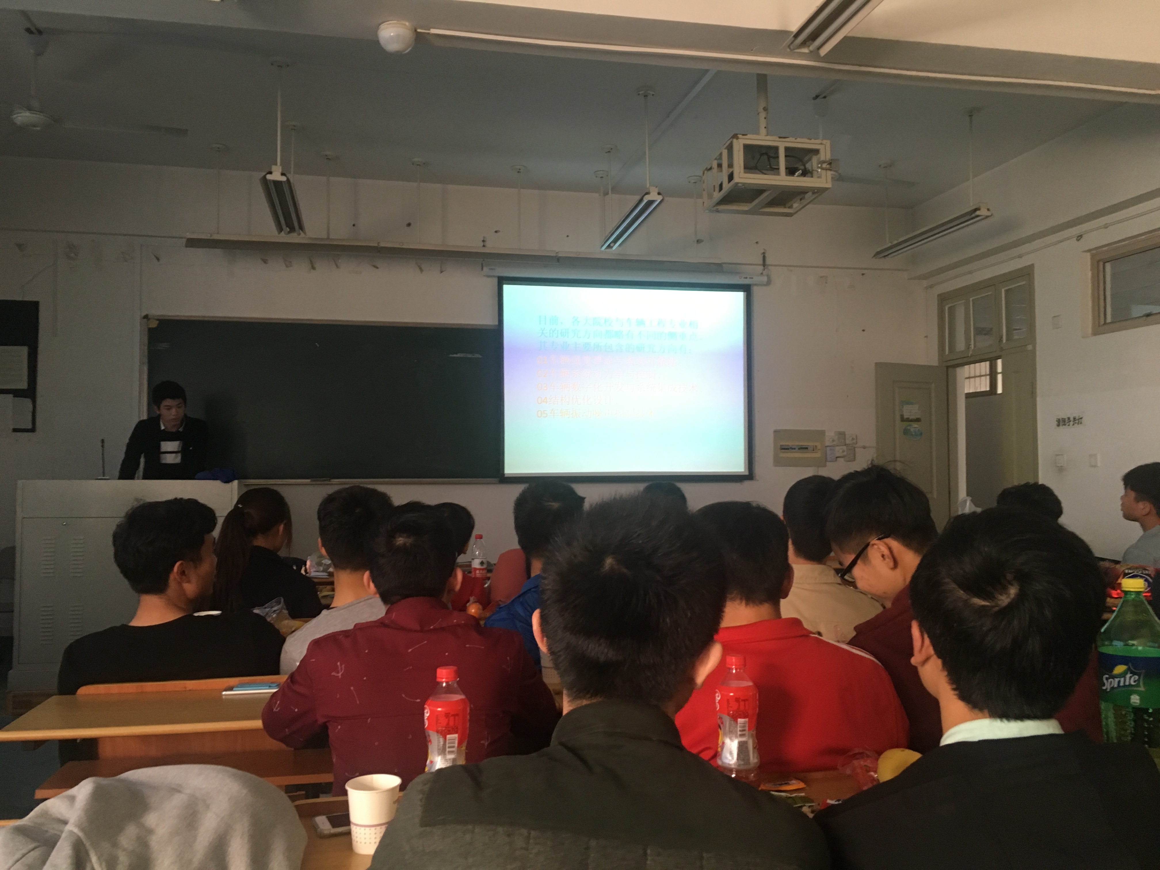 接着,黄智博同学为同学们列出了本专业在接下来的专业选修课的将会遇到的各项课程,并对各个课程的内容、用途进行了简单的介绍。并且他还为同学们介绍了本专业考研的相关内容以及在车辆工程专业名词靠前的研究生院校。