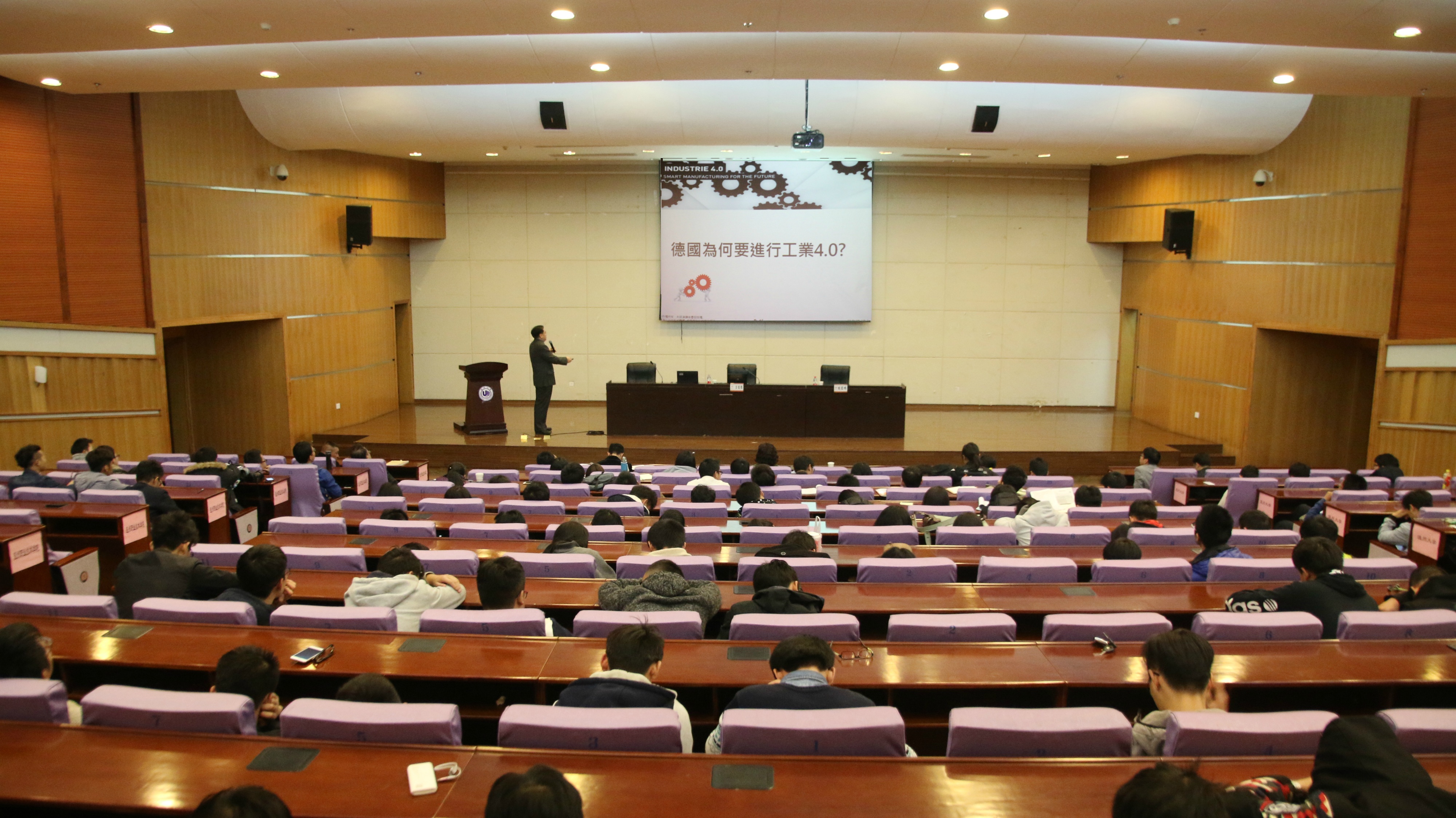 吕俊德副教授从工业4.0的内涵及背景开始,介绍了工业4.0生产工厂的自动化、资讯系统、流程以及系统能源,提出了建立先进工业观念的必要性,并从工业的发展、升级和创新说明了工业4.0的基本框架,以及在各个领域的应用。吕教授着重介绍了工业4.0背景下智能工厂和工业机器人,用德国实验室的实例和展会的视频资料生动的展现了国际前沿的研究进展及技术现状。最后,吕教授指出,是工业技术、工业体系以及工业结构三部分共同构成了工业4.0。在交流环节,现场师生积极参与,与吕教授共同探讨工业4.0的未来以及对我们生活的影响,现场气氛活跃。