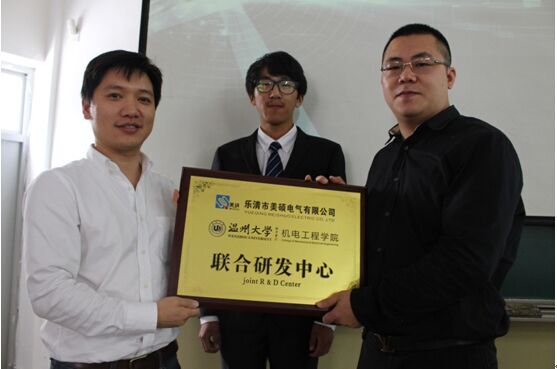 首先是联合研发中心成立挂牌仪式。为进一步推进区域产业转型升级,走产、学、研一体化的校企联动发展道路,成人网 与美硕电气有限公司成立了联合研发中心 ,由成人网 副院长李峰平、美硕电器副总经理虞彭鑫一起上台揭牌。