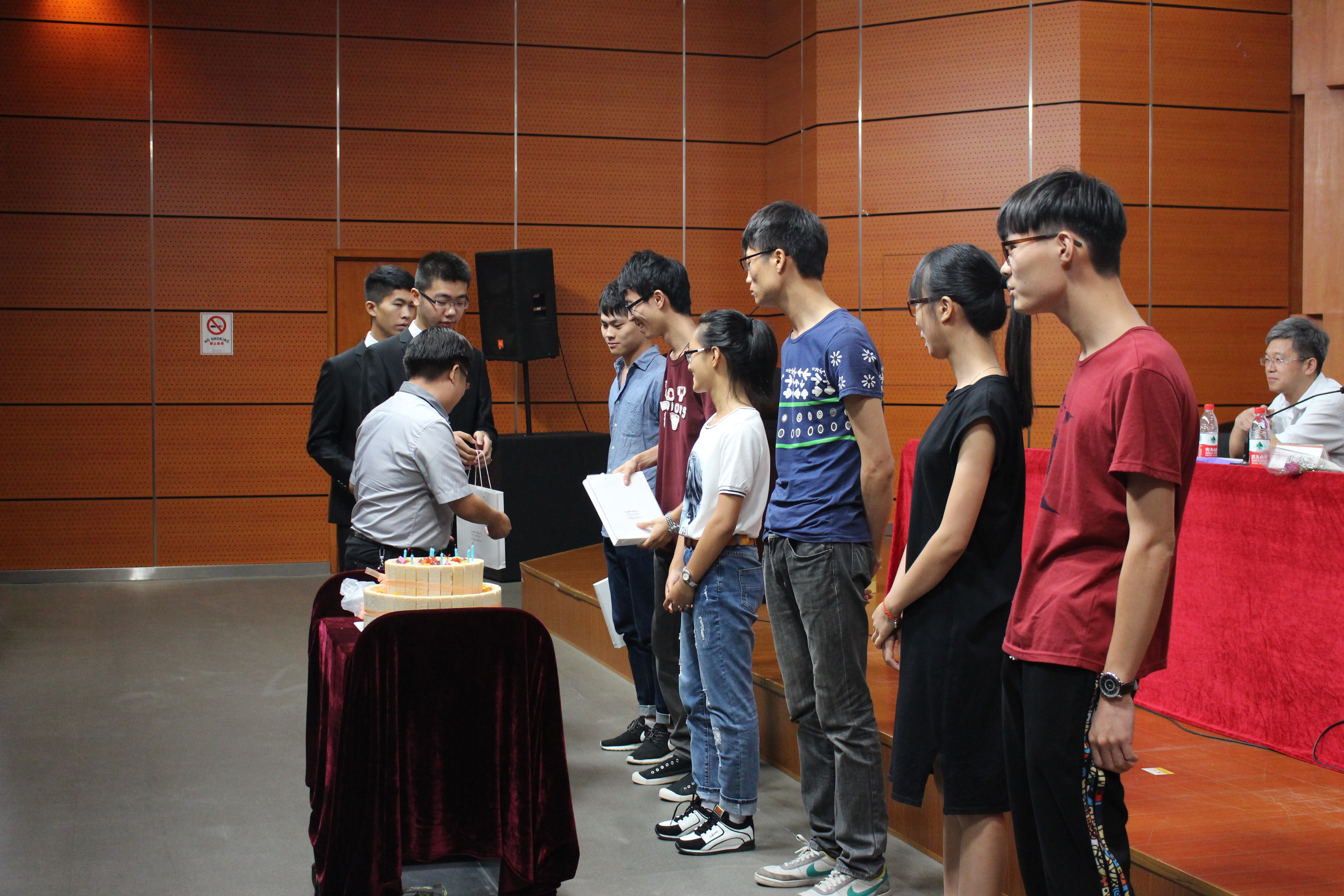 由于9月10日还是一个特殊的日子——第31个教师节,学院特地准备了鲜花,新生代表为班主任们敬献鲜花,感谢老师们接下来四年时光的陪伴;同时也为在场的所有老师送上鲜花和温暖的祝福。而温馨的氛围还未散去,之后的环节更是暗藏了一个巨大的惊喜。灯光一暗,音乐响起,一个意味着新开始新起点的生日蛋糕献给当天生日的6名新生,祝福于心,伴其同行。在全场合唱生日歌的温馨气氛中,周院长为6名“小寿星”送上了生日礼物,6名新生也在这个意外惊喜中收获了满满感动。