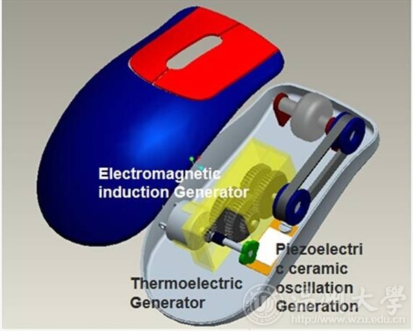 与市场上现有的无线鼠标相比,“1+1自发电无线鼠标”的创新之处在于,它不依靠干电池供电,而是自己给自己供电。它利用无线鼠标滚珠的旋转带动传动驱动二级加速器发电系统。同时,通过安装在齿轮箱输出轴花轮冲击悬臂压电陶瓷片,以产生电力并存储在内置锂电池中。简而言之,自发电无线鼠标就是将鼠标使用过程中的滚动能量通过一系列装置搜集起来,并转换成电能返充到锂电池中。“1+1自发电无线鼠标”在设计中采用了2种方式收集微电,这也正是其命名为“1+1自发电无线鼠标”的原因。