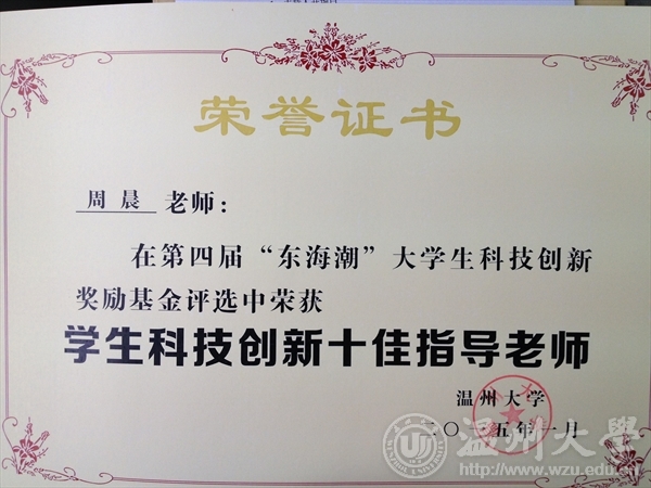 周晨老师荣获“学生科技创新十佳指导教师”荣誉称号
