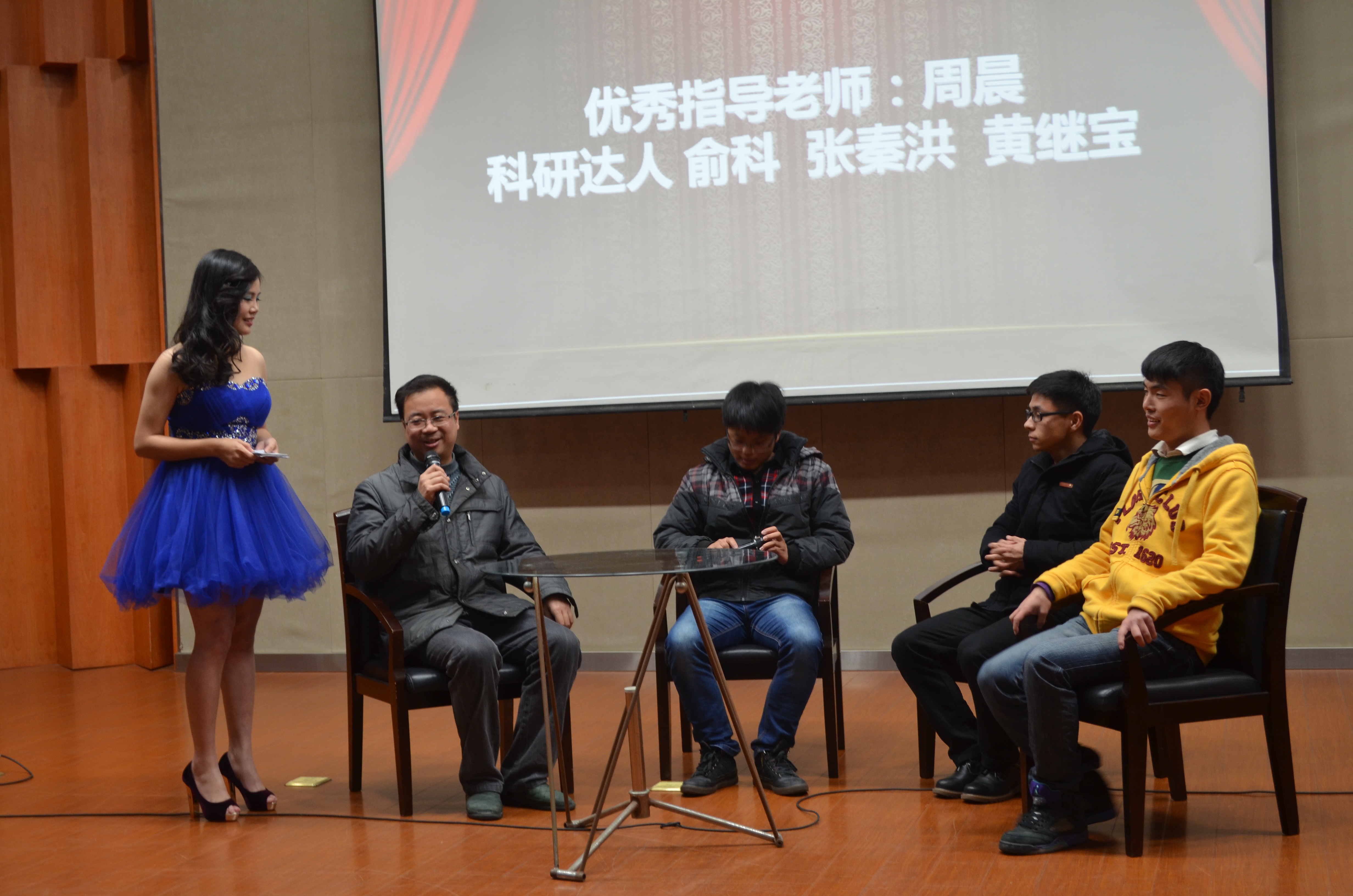 随后,科技成果表彰及颁奖仪式开始。成人网 第六届“科技之光”活动月较往年又有了新的突破,八个比赛项目累计报名参与人数达到1000余人次,大大提高了学生参与面。“科技之光”活动月一个个子活动的颁奖仪式把本次活动的氛围推向高潮,首届自行车功能和结构创新大赛、机械加工大赛、机械制图大赛、优化设计大赛等,踊跃参与“科技之光”系列竞赛活动并获奖的同学们纷纷站上领奖台,展现出成人网 学生勇于创新、勤于实践的风采。然后钱金贵与周轶婷两位科技之星代表给大家分享了他们的科研经历,让我们明白科技创新的每一个成就背后都充满了艰辛和曲折,克服一个个困难的过程才能体现我们出不断发现问题并解决问题的能力。除了科技之光活动月的各类竞赛,今年成人网 在挑战杯、全国机械设计大赛等学科竞赛,以及科研、论文等取得丰硕成果。屏幕上投影的那一幕幕画面,展示了过去一年中成人网 本科生和研究生们在论文、课题、学科竞赛方面的成就。对获奖学生的颁奖更是赢得了一阵阵掌声。最后的访谈环节,“学生科技创新优秀指导老师”周晨老师和科研达人俞科、张秦洪、黄继宝同学与广大参会同学展开了积极的互动环节,并为同学们解答疑难,分享了他们的科研心得。