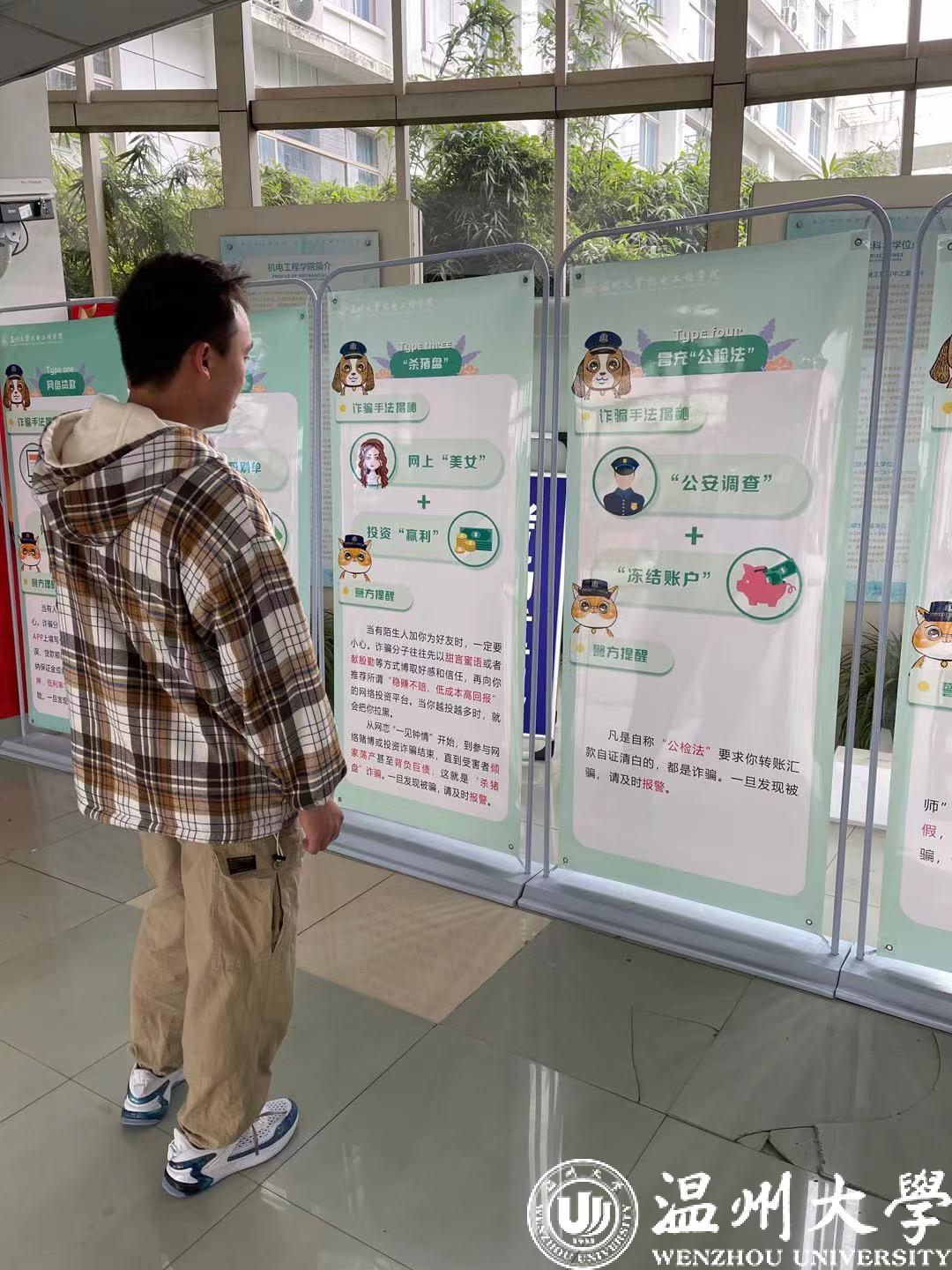 我院充分利用一楼大厅,向同学宣传展示网络贷款、网络刷单、“杀猪盘”、冒充“公检法”、“荐股”、冒充客服退款、虚假购物、注销“校园贷”、虚假购物买卖游戏币等十大高发校园通讯网络诈骗手段,并对诈骗手法进行解密,引导同学提高自我防范意识,一旦被骗,要及时报警。