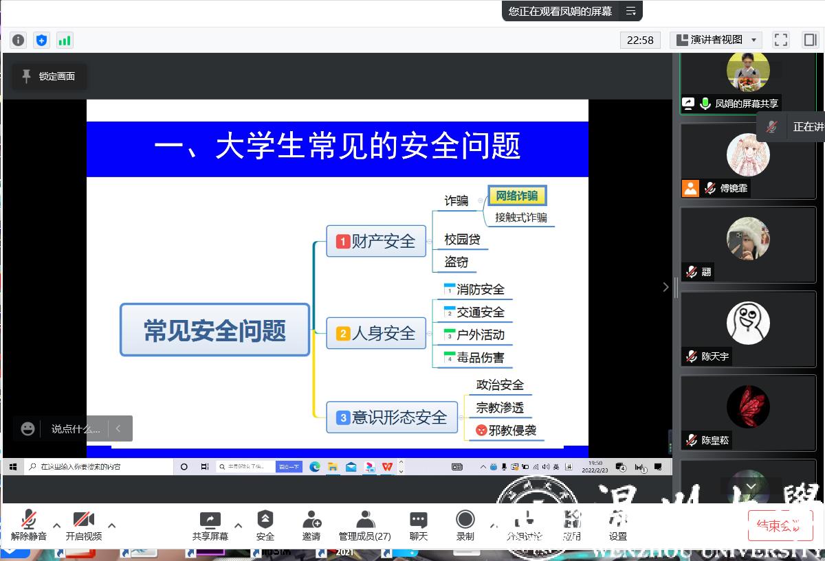 当前,新冠疫情形势依然严峻,为确保学生的健康安全,辅导员重点强调了学校有关疫情防控的要求,“非必要不离校”,佩戴口罩,进出校园主动出示温州防疫码,遵守学校疫情防控政策。