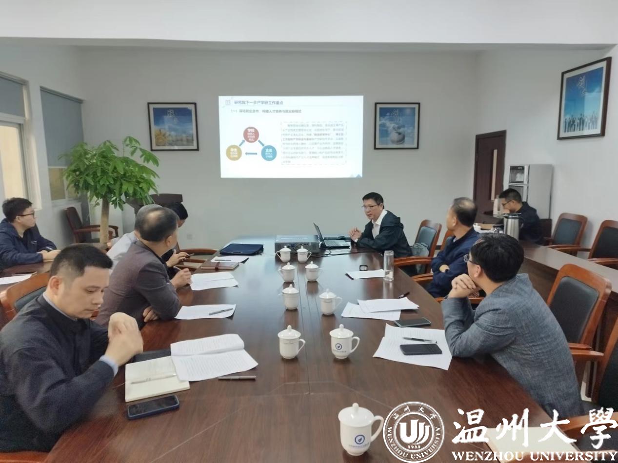 调研座谈会在温大苍南研究院举行,温大苍南研究院张淼院长在会上作了研究院基本情况、成立五年来工作成就及下一步工作计划的汇报。研究院五年来整合组建三支服务团队,累计协助苍南人才办申报5名省千人才和2名国千人才,全球精英引进计划1人,浙江省创新团队1支,为苍南产业引进6名产业咨询专家和3名产业需求技术专家;研究院累计帮助苍南柔性引进各类产业急需各类技术专家和拔尖人才共20名,包括“国家千人”专家朱伟东教授、“国家万人计划”邹军教授等。累计同企业签订横纵向项目(课题)89项,与苍南仪表集团等联合申报国家重点研发计划1项,申报省重点研发项目6项,获批1项,申报温州市重大科技创新攻关项目4项,温州高校科协“产学研”融合项目2项,助力苍南传统产业技术提升工作6项。研究院累计服务与对接340多家企业,帮助苍南企业解决各类技术咨询和难题80多项,开展企业实地科技服务达800多人次,累计与苍南企业联合共建33个产学研合作基地,开展科研训练及专业实践活动人数达300多人次;帮助苍南企业共建5个省研发中心;累计申请发明专利100多项,其中发明已授权24项;累计实现科技成果转化19项,成果转化金额630多万元,成果转化帮助企业新增产值预计约2800多万元。学院党委周荣书记介绍了苍南研究院创业艰辛,五年来研究院不断提升能力,为学校人才培养与服务地方探索出了一条新路。