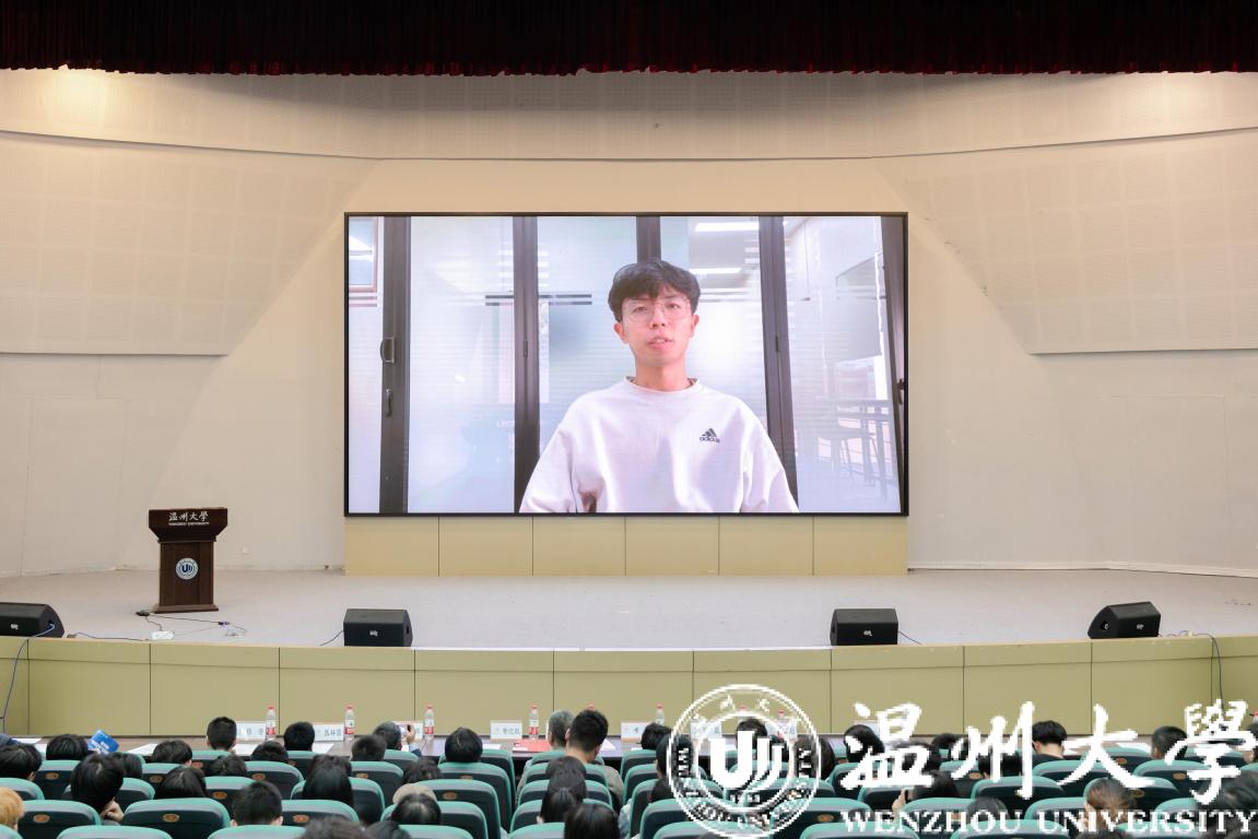 本科生优秀学生代表胡维峰作报告。胡维峰以“如何将学习渗透到竞赛”为主题,鼓励同学们要“把握时光,沉下心来”,通过比赛,将课堂知识用于实践,进而提高自身协作能力及统筹规划能力。
