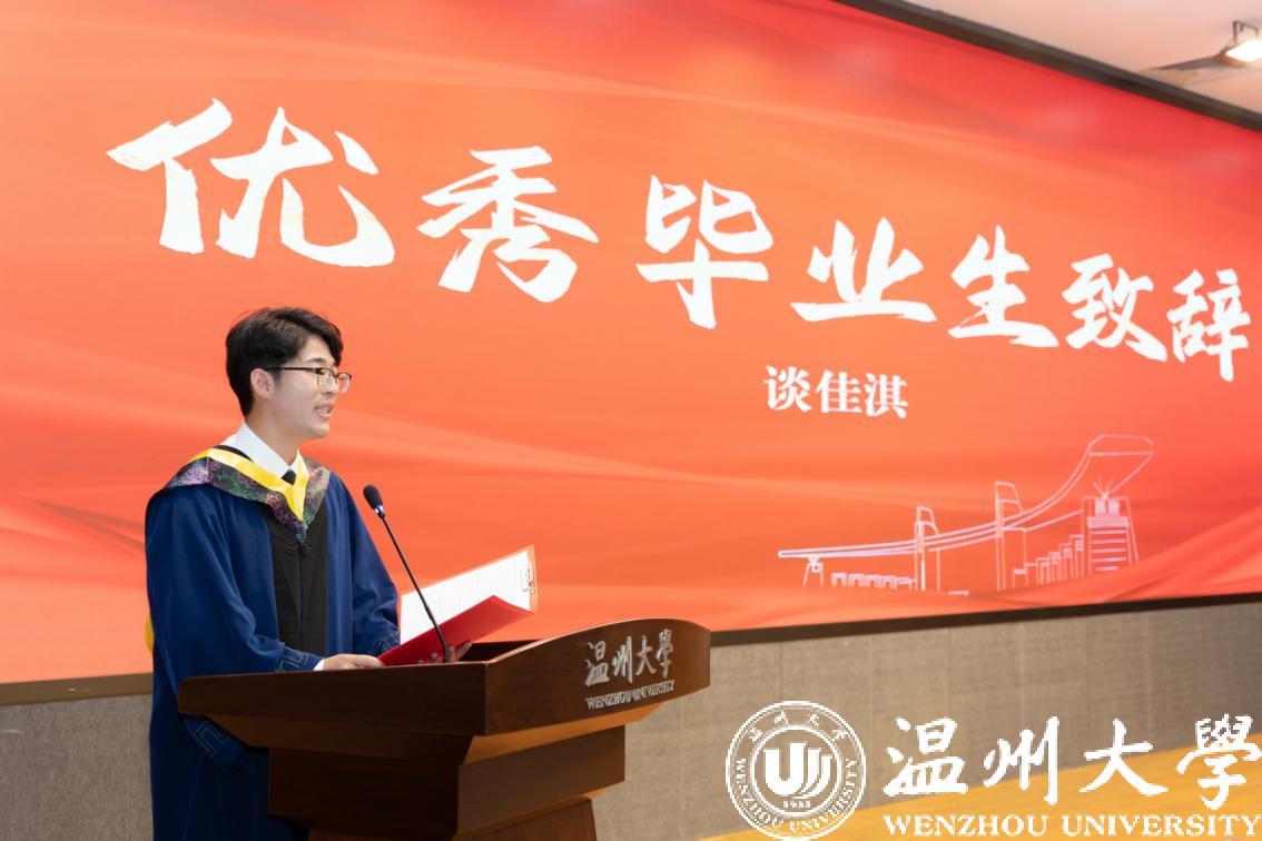 研究生优秀毕业生代表谈佳淇作为学生代表发言,他表示毕业是一个人成长的标志,也是一个人告别的时刻。回首这段求学之旅,同学们经历了无数的挑战和困惑,但也收获了成长和坚韧,母校就像一束温暖的光芒,指引学子前行,每当同学们迷茫时,老师就像一股力量,给予学子支持和鼓励。感谢母校,感谢老师,感谢所有曾经帮助过我们的人。