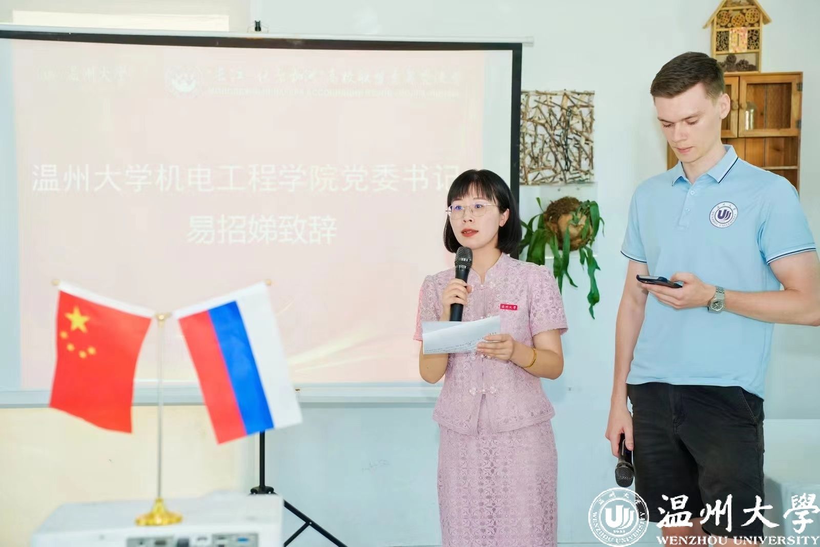 2024年7月6日,俄罗斯伏尔加河沿岸联邦区青年长江行(温州站)活动迎来最后一天的精彩时刻。经过五天的文化交流与探索,俄罗斯青年代表们在温州和杭州度过了充实而难忘的时光。清晨,9名青年代表和5名成人网 学生代表从杭州乘坐高铁返回温州,前往山根小镇参加结营仪式。参加本次结营仪式的领导有成人网 党委书记易招娣,茶山街道办事处副主任周丹,温州国际传播中心主任郑国健,国际处副处长熊勇,成人网 副院长黄沈权,以及全程参与本次活动的耿燕飞,柯一睿和冯铭3位老师。首先,成人网 党委书记易招娣在致辞中强调了本次中俄文化交流活动的重要性。希望通过此次活动,能够加深两国青年之间的理解与友谊,促进中俄文化的融合与发展。