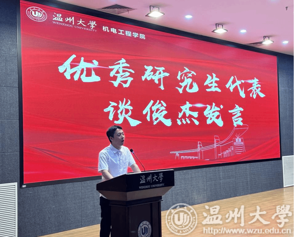 优秀学生代表谈俊杰结合自身的科研经历,从学会“独立思考”、学会“时间管理”、学会“团队合作”、学会“坚持不懈”四个方面向师弟师妹们分享了个人经验。希望大家能够珍惜三年的宝贵时间,牢记“求学问是、敢为人先”校训精神,在温大成就更加卓越的自己、收获更加精彩的人生。