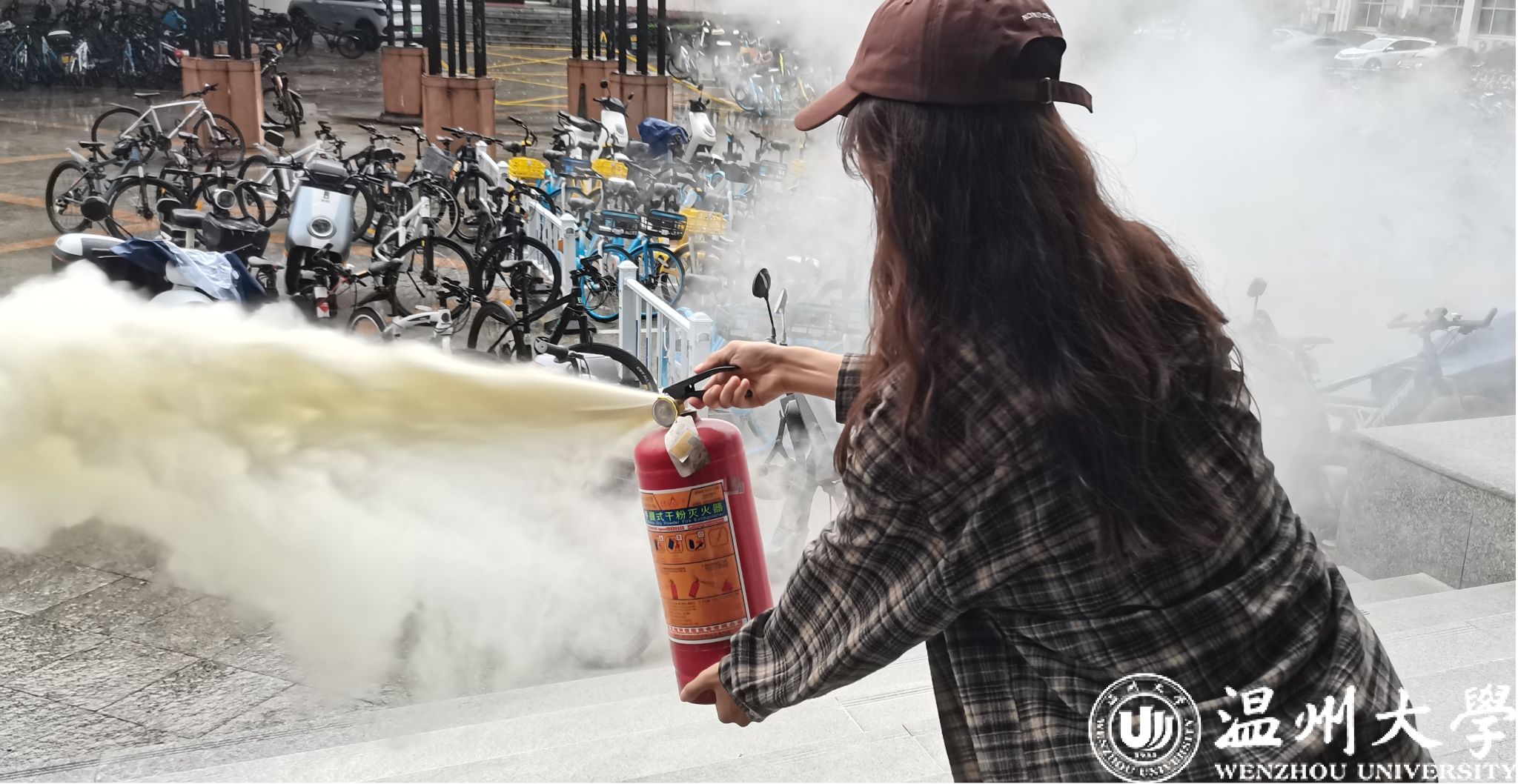 在全体师生到达安全点集合并完成人数清点后,凌建国老师在机电楼一楼为师生带来干粉灭火器的使用指导,传授“一提二拔三握四压”使用口诀,并亲自操作示范、邀请同学上前操作感受,体验如何灭火。