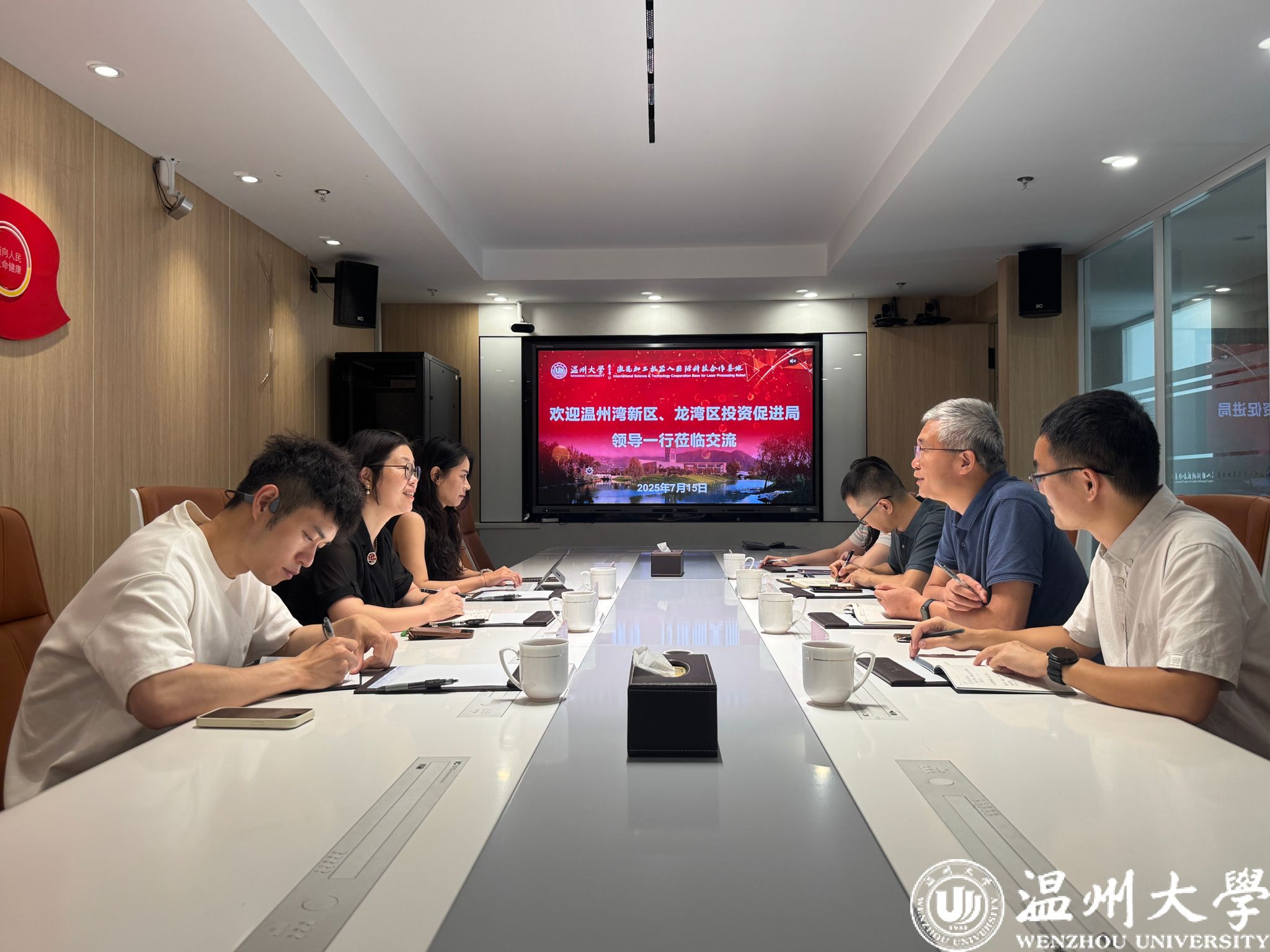 2025年7月15日上午,温州湾新区、龙湾区投资促进局副局长陈海鸥、区招商服务有限公司董事长陈自惜率队赴学院激光加工机器人国际科技合作基地(以下简称“激光基地”)考察调研,就深化产学研合作、推动区域激光产业协同创新与学院、温州市激光行业协会展开深度洽谈。学院副院长朱德华、张斌斌,温州市激光行业协会秘书长冯爱新教授等参加调研交流。