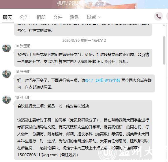 近日,成人网 研究生党支部开展了“考研结伴行,大疫人有情”为主题的党员一对一帮扶活动,主要对参加考研同学进行与答疑与经验分享,研究生党支部党员及积极分子等20多名同志,踊跃投入到此次一对一帮扶活动当中。