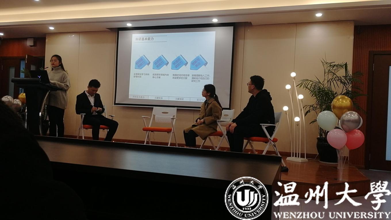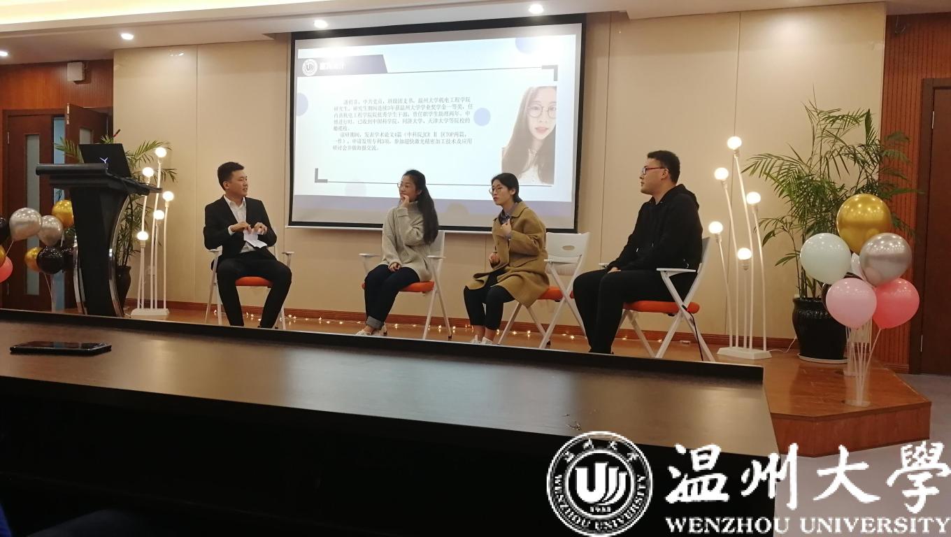 12月19日,成人网 成功举办2019年优秀学子学术经验交流会。交流会邀请到浙江省“十佳大学生”、新加坡南洋理工大学在读博士龚玲艳,17级刘琨、潘俏菲、高闯分享了各自的学术经验。学术分享会吸引了我院众多研究生和本科生前来驻足聆听。