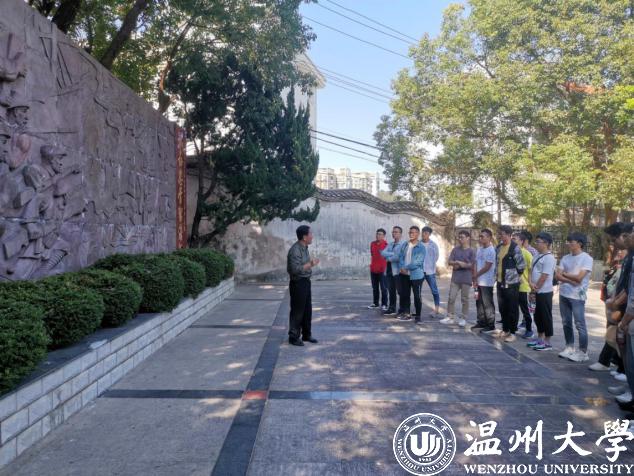 在烈士陵园纪念石雕群前,我们很荣幸的遇到了一位老党员,77岁的郑元考先生,他很高兴看到今日朝气蓬勃的温大学子来缅怀先烈、参观烈士陵园,自发地向我们介绍了先烈们的伟大事迹,郑老先生虽过古稀之年,但是石雕上每一位先烈的事迹他都记忆深刻,八路军坚守洞头阵地、八路军以两百人抵挡日军两千人、洞头群众向人民子弟兵输送物资,掩护撤离等等这些先烈们英勇伟大的事迹,他向我们一一详细介绍而来。在讲解过英雄石雕后,郑老先生勉励我们大学生要心系国家,珍惜幸福生活,将自己的点滴发展致力于我们祖国伟大复兴的征程之中。