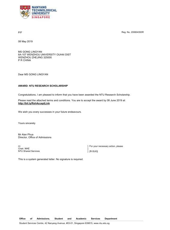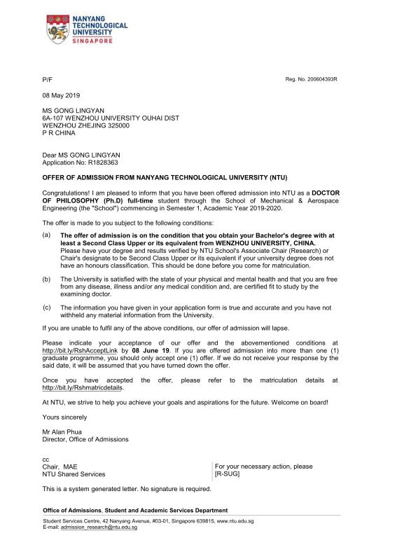成人网 15级机械工程(国际化)专业本科生龚玲艳,在我校李子瑞教授的精心培养和指导下,成功获得新加坡南洋理工大学博士录取(机械与航天航空工程学院),并获该校全额奖学金(NTU RESEARCH SCHOLARSHIP)。