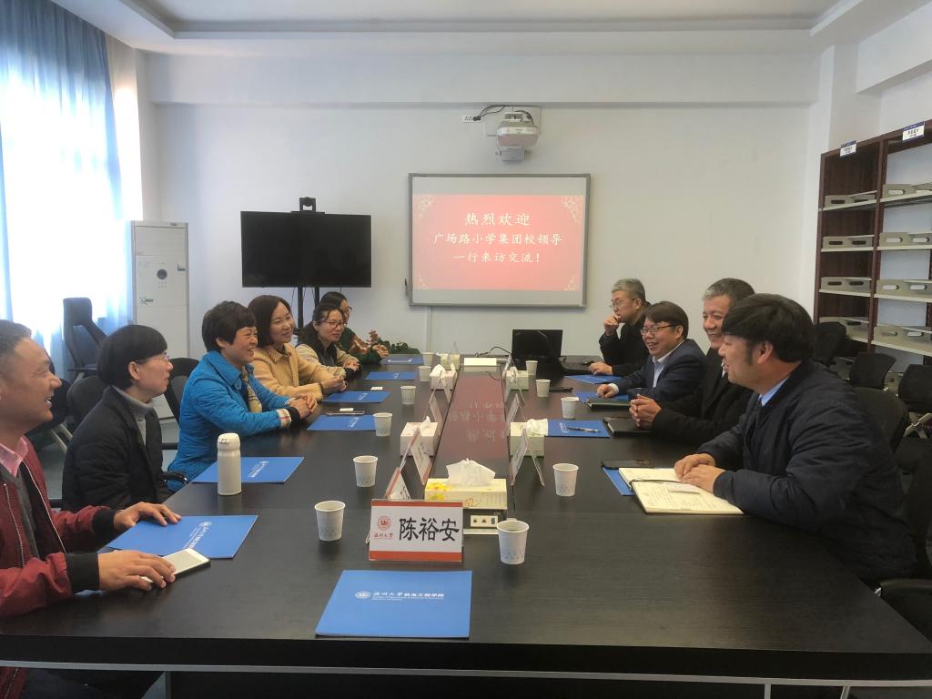 周宏明院长向来访客人介绍了学院师资队伍、学科科研平台、研究方向以及人才培养情况。广场路小学集团校长杨素琴简要介绍了广场路小学集团四个校区的情况,她表示此行目的是希望小学的实践教育能得到高校更高层面的指导,广场路小学在信息技术方面已成立机器人实验点进行机器人知识的普及和基础教育,希望能与我院实现合作。随后,广场路小学集团教师也就教学工作方面与我院领导进行了交流。大家都认为在小学生培养方面,兴趣是最好的老师,要鼓励学生动手制作、进行创新。