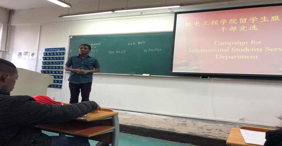 为了给留学生提供更好的服务平台,以加强中外学生的交流及更好地对接学院学生会,学院经过近半个学期时间的筹备,成立了留学生服务部。现场,5位留学生参加了干部竞选演讲,表达了自己的竞争意愿及今后努力的方向。通过最终的投票,研究生ADEYEMI KENNETH BAMIDELE以最高票当选部长,MUPFUKIREI LEAVEN ROMEO和MWANGOSI GAYO GABRIEL当选副部长。