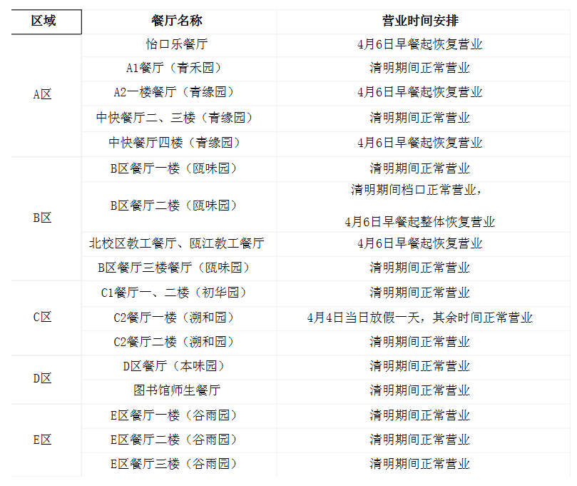 根据学校2021年清明放假的通知,202143日至45日为2021年清明假期,现将各餐厅营业时间安排通知如下: