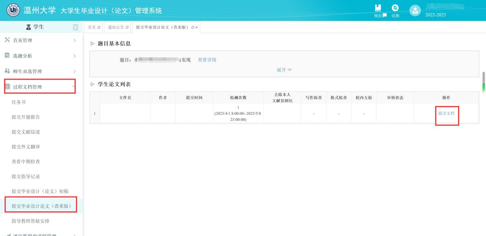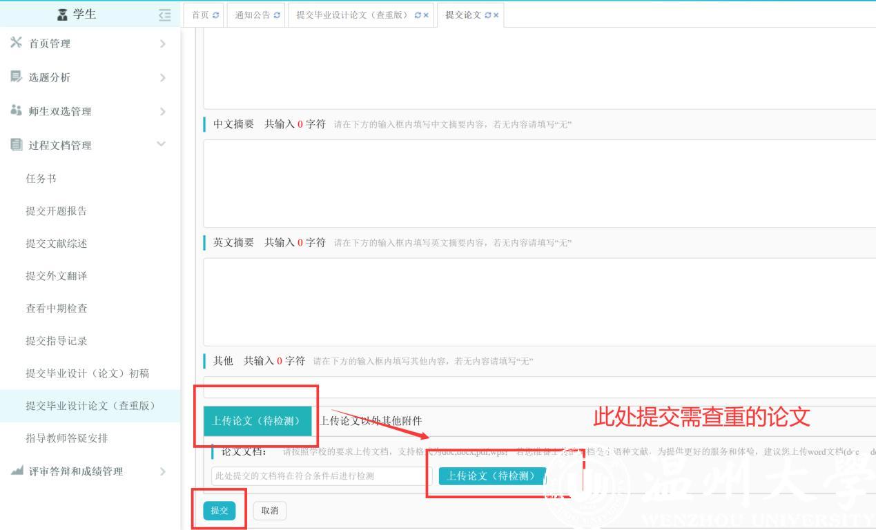 1. 学生登陆毕业设计系统,在过程文档管理——提交毕业设计论文(查重版),指导老师进行审核。