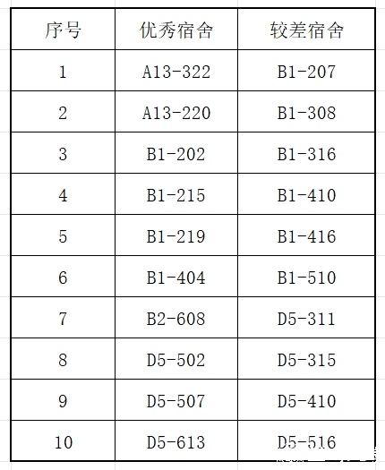 为进一步加强学生宿舍管理,提升宿舍卫生环境,消除安全隐患,学院于3月5日、3月6日,组织各年级辅导员及志愿者对本院所有学生宿舍进行了全面细致的检查。经过认真检查和评估,现将检查结果通报如下: