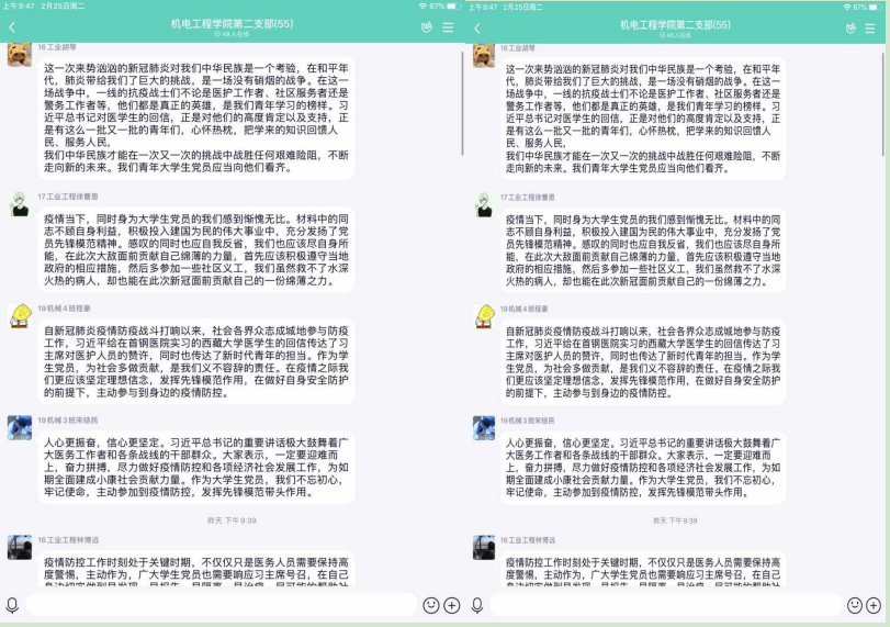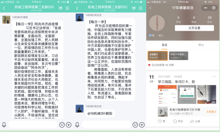 为了更好的落实教育部及浙江省教育厅“停课不停学、学习不延期”的相关要求,成人网 积极部署学生的线上学习工作,成人网 根据专业特点,发动全体师生,积极投入到停课不停学的工作中。学生党员在班级中充分发挥模范作用,每次的班级考勤、课堂问答、作业完成,学生党员都是走在前列,为了更好的了解学生在家的状况,学校推行每日健康打卡活动,在党员作为负责人的班级,每天认真填写并且督促同学们完成,完成率也是整个学院最高的!
