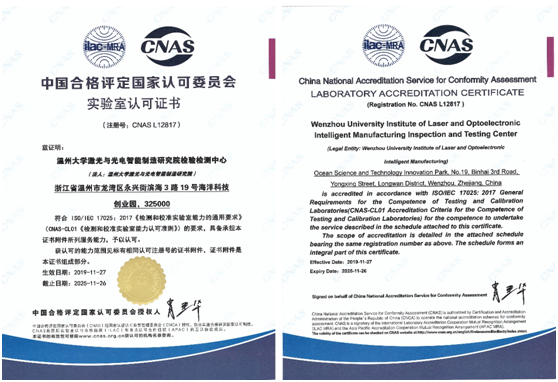近日,成人网 激光与光电智能制造研究院检验检测中心近日获得了中国合格评定国家认可委员会授予的CNAS认证和国防科技工业实验认可委员会授予的DlLAC认证,具备了作为第三方检测机构的能力,顺利跻身国家认可实验室行列。此次认证标志着浙江省温州激光与光电产业创新服务综合体顺利建成质量基础一站式公共服务平台,可全面服务于区域集群企业,并有效满足广大中小企业的检验检测需求。