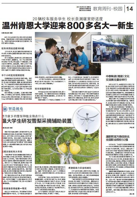 发现采梨机有大市场“梨花带雨”雪梨采摘辅助装置的研发团队都来自温大成人网 的,当时研发时,都还是大二的学生。“我们当时参加省大学生机械设计竞赛时,题目要求就是制作水果采摘机。我们几个人一商量发现,温州文成县十源乡山头坪村具有‘雪梨种植基地’的称号。我和成员岑伟鹏的家乡也有种植黄花梨,刘荣荣的家乡在山西,也有很多品种的梨。我们当时就觉得,做采梨机的题目是有非常大的应用价值。”团队负责人孙智超介绍说。