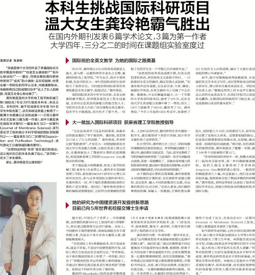 龚玲艳是成人网 机械工程(国际化)专业2015级的本科生,来自义乌。本科四年,她不仅成绩在全年级164名学生中排名第二,还在科研这条路上取得了一般博士生都难以企及的成果——已有6篇学术论文发表(3篇为第一作者),其中5篇发表在国际学术期刊(一篇发表在SCI一区期刊《Journal of Membrane Science》,该刊是化学工程和高分子科学领域的国际顶级期刊之一;一篇发表在SCI二区期刊《Separation and Purification Technology》,该刊是化工分离领域的著名期刊)。
