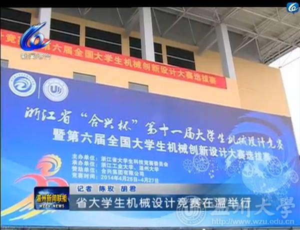 4月26-27,浙江省“合兴杯”第十一届大学生机械设计竞赛暨第六届全国大学生机械创新设计大赛选拔赛在成人网 举行。温州电视台26日晚以《省大学生机械设计大赛在温大举行》为题播出大赛情况。