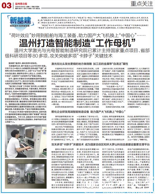 该研究院还依托成人网 机械工程一流学科以及一批国家和省部级科研平台,同时整合北航温州研究院、北京大学-温州激光与光电子联合研发中心、中科院西安光机所等力量,打造形成浙江省温州激光与光电产业创新服务综合体,成为国家自创区和环大罗山科创走廊建设的重要支撑平台。目前该综合体已累计引进30多个激光与光电项目入驻。产业集群已构建起以激光、光电能源、半导体照明、光通信为特色的产业链,集聚了以奔腾、嘉泰、瑞浦新能源等为代表的激光与光电行业关联企业280余家,实现营业收入超685亿元,温州已初步成为浙江乃至长三角激光与光电产业应用的创新创业高地。