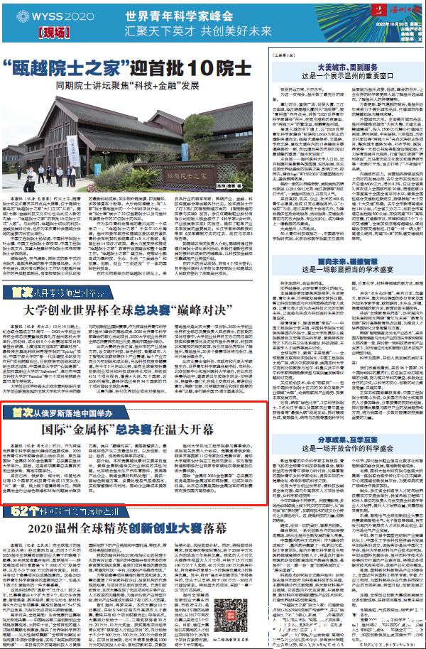 本报讯(记者 周大正)昨日,作为首届世界青年科学家(温州)峰会的重要成果、2020世界青年科学家峰会核心活动项目,第五届国际“金属杯2020金色赛季”总决赛在成人网 举行。据悉,这是该项赛事总决赛首次走出俄罗斯,落地中国举行。