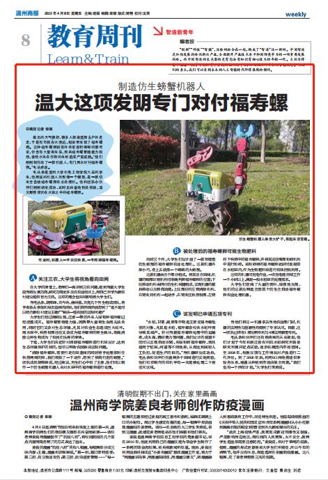“水稻、甘薯、蔬菜等作物是主要受福寿螺危害的对象,尤其是水稻,福寿螺会咬食水稻叶而导致其减产。针对当前福寿螺卵处理中的运输难、成本高、费时费力等问题,我们设计的装置不但可以实现自动识别、夹取粉碎福寿螺卵,而且适用于稻田、河道等不同地形,从而达到减轻人工负担、促进生产的目的。”当机器研发成功后,毛丛余和伙伴们在温州多个田间进行实地测验,他们初步制作的样机平均一天能够处理二十亩受灾区域。