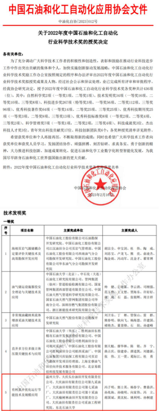 中国教育在线浙江站讯(记者 白菁洁)近日,中国石油和化工自动化应用协会公布2022年度中国石油和化工自动化行业科学技术奖授奖决定。以成人网 为第一完成单位,由成人网 冯子明教授、向家伟教授和黄沈权副教授等完成的“油杆泵井优化运行节能技术及规模应用”项目荣获2022年度中国石油和化工自动化行业科学技术奖技术发明一等奖。