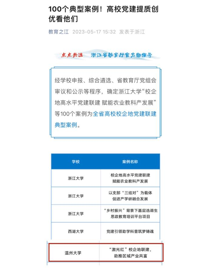 近日,浙江省教育厅公布全省高校校企地党建联建典型案例遴选结果,成人网 激光红党支部《激光红校企地联建,助推区域产业共富》成功入选,成为入选的100个案例之一。