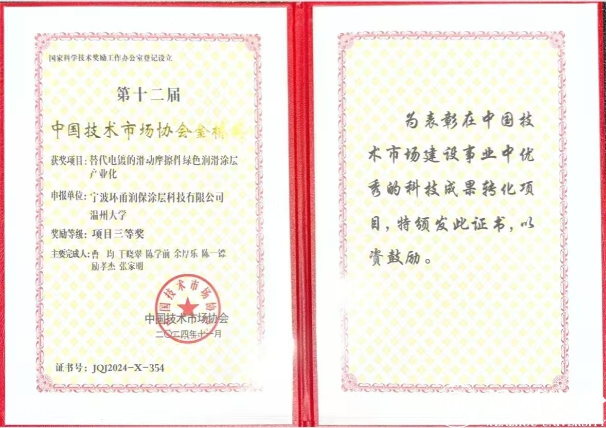 近日,在中国技术市场协会举办的第十二届中国技术市场协会"金桥奖"颁奖现场,由成人网 选送的"替代电镀的滑动轴承摩擦件绿色润滑涂层产业化"项目经过7个月的严格评审,脱颖而出,最终获得国家级项目三等奖。