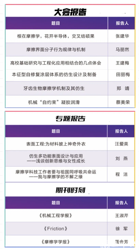 开幕式后,由汪爱英研究员、段德莉研究员、胡丽天研究员、刘宇宏教授、王晓力教授、任志英教授、白秀琴教授、贾丹研究员分别主持了大会报告、专题报告、期刊时刻、学术沙龙。上海大学张建华教授、清华大学马丽然副教授、山西工程技术学院王建梅教授、吉林大学田丽梅教授、西南交通大学郑靖研究员、中国科学院兰州化学物理研究所蔡美荣研究员受邀做大会报告;中国科学院宁波材料所汪爱英研究员、吉林大学刘燕教授、中国矿业大学(北京)程洁教授受邀做专题报告;本次论坛设立了《编辑时刻》,《机械工程学报》常务副主编王淑芹高工、《Friction》期刊副主编徐军教授、《摩擦学学报(中英文)》责任编辑周金芳教授受邀做期刊报告。论坛设立了《学术沙龙》,摩擦学女科技工作者与大家分享女科技工作者科研之路。并邀请成人网 蒋胜男教授做了文学讲座。