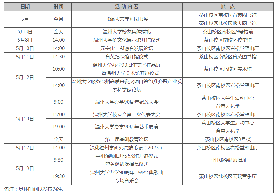 盛世相约,同庆华诞。2023年是成人网 “校庆年”,5月为“校庆月”。学校将举行校庆系列活动,5月13日上午9时举行办学90周年纪念大会,下午3时举行校友会第二次代表大会,晚上7时举行办学90周年艺术展演。同时,学校还将开展服务温州高质量发展项目签约推介暨产业发展科学家论坛、深化温州学研究高端论坛、基础教育论坛等系列学术性活动,举行美术馆、侨文化展示馆、育英纪念馆等开馆仪式,及校友集体婚礼。
