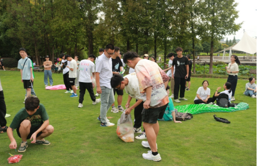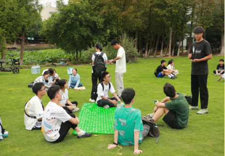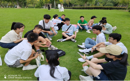 在班委和班助的组织协调下,活动如约展开。大家分组坐在草地上开始进行了你画我猜游戏。哪怕一开始连组内人员的名字都没有记清楚,但大家相处起来,却像是相识已久的亲友。